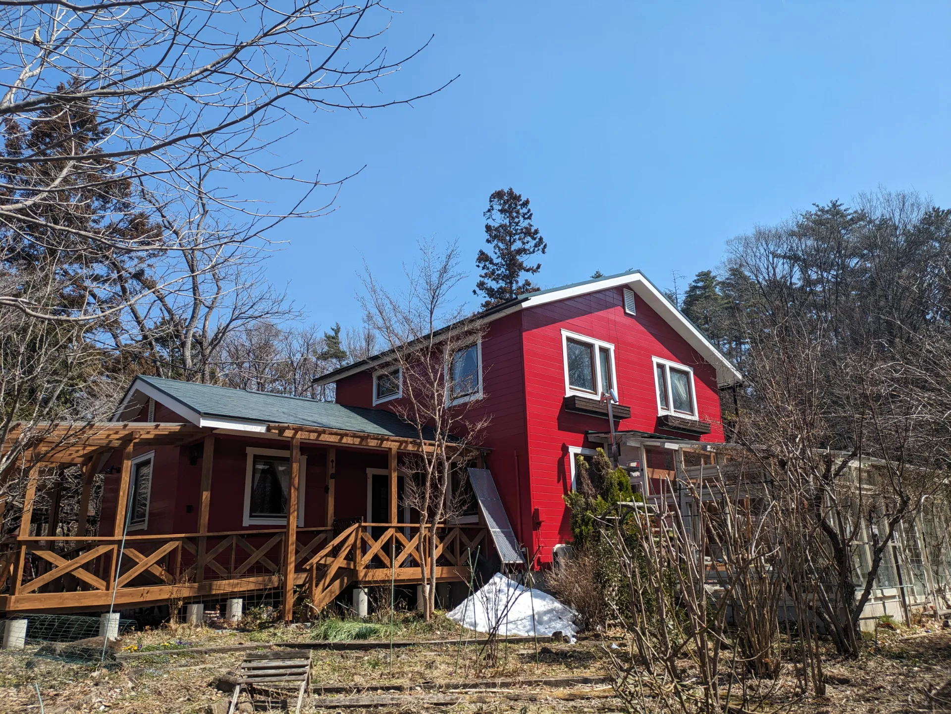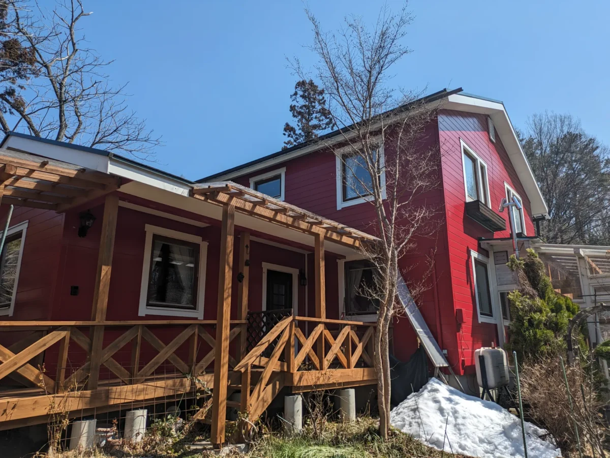 山梨県北杜市にお住いのI様は、もともと都心に住まわれていましたが、自然環境に魅せられ、北杜市に移住されてきました。 冬の寒さ対策としまして、高気密、高断熱の輸入住宅を建てられ、北欧デザインという事もあり、青や赤の基本色がとても合います。もともとの青系から今回、塗り替えのタイミングで赤系の外壁色にされイメージを一新されました。